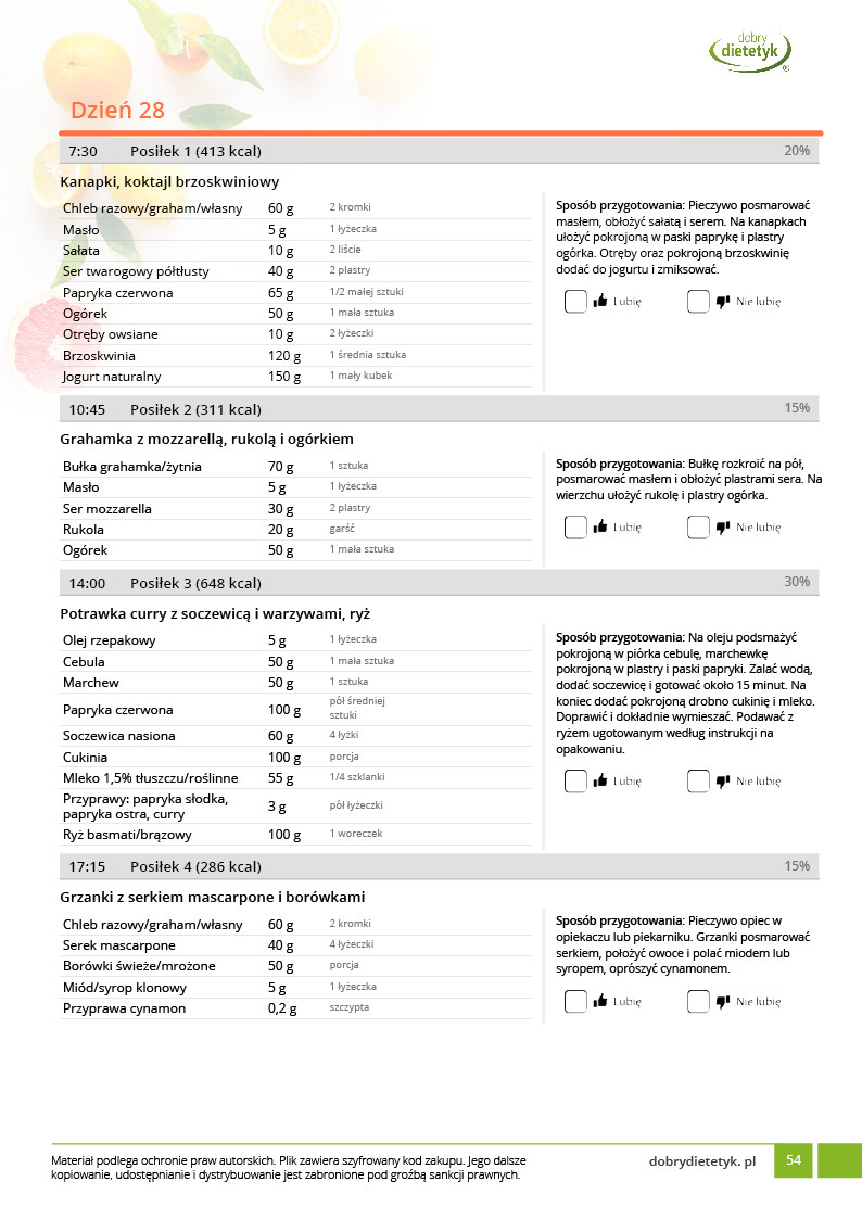 w formie precyzyjnych jadłospisów wielodniowych (na każdy dzień miesiąca jest opracowany osobny jadłospis). Tutaj nie musisz zastanawiać się co zjeść każdego dnia, gdyż będziesz mieć dokładnie wszystko rozplanowane.