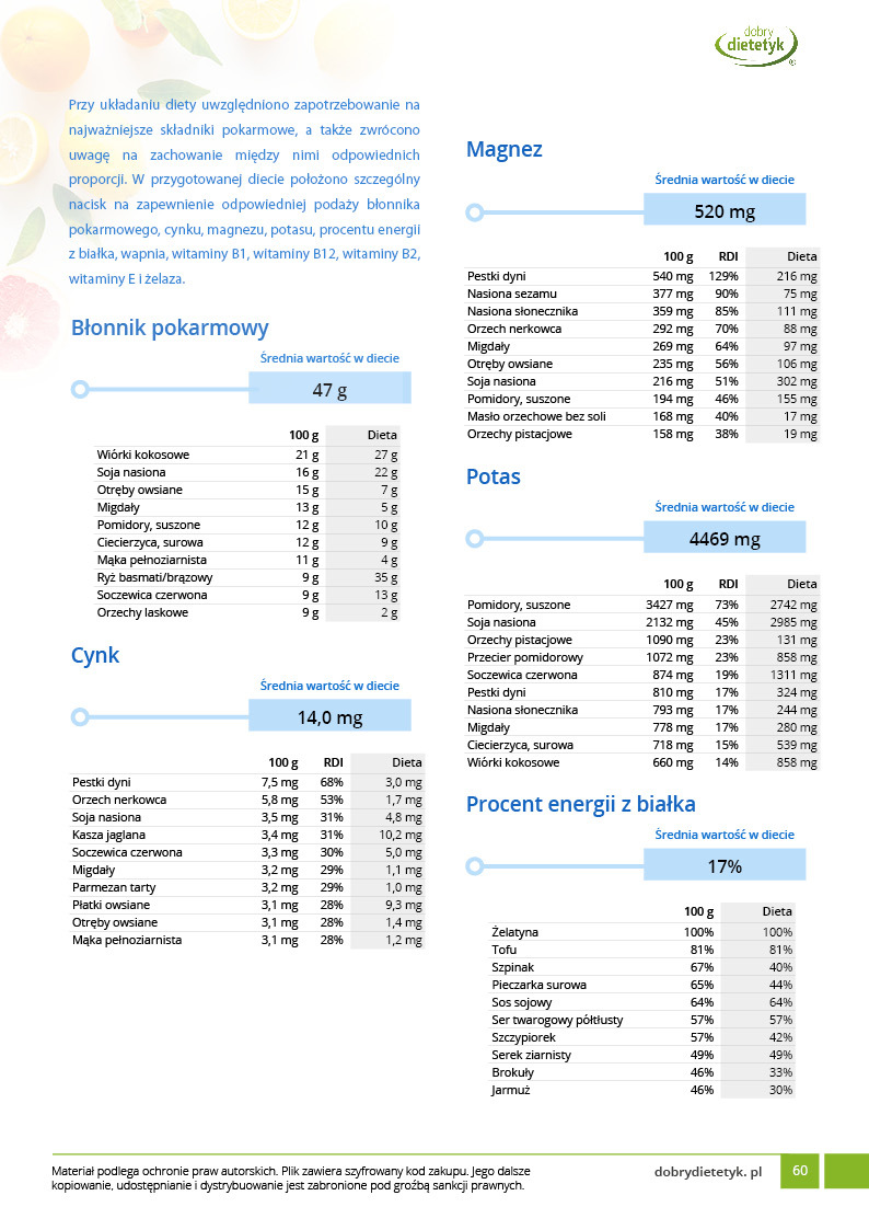 Kompleksowy, 30 dniowy program dietetyczny opracowany specjalnie dla MĘŻCZYZN praktykujących lub chcących praktykować WEGETARIANIZM. Jadłospis oparto o produkty pochodzenia roślinnego z niewielkim dodatkiem produktów mlecznych o dużej zawartości białka. Dieta została skomponowana przez zespół dietetyków specjalizujących się w tematyce diety wegetariańskiej. Ta bardzo urozmaicona, niezwykle pożywna i wyjątkowo smaczna dieta zadowoli każdego, kto szuka zdrowych i wartościowych dań wegetariańskich. Pod względem odżywczym w diecie położono w szczególności nacisk na podaż takich składników jak białko, żelazo, witaminy grupy B oraz wiele minerałów których często brakuje w dietach roślinnych. Dieta idealnie nadaje się dla osób, chcących też spróbować takiego modelu żywienia.