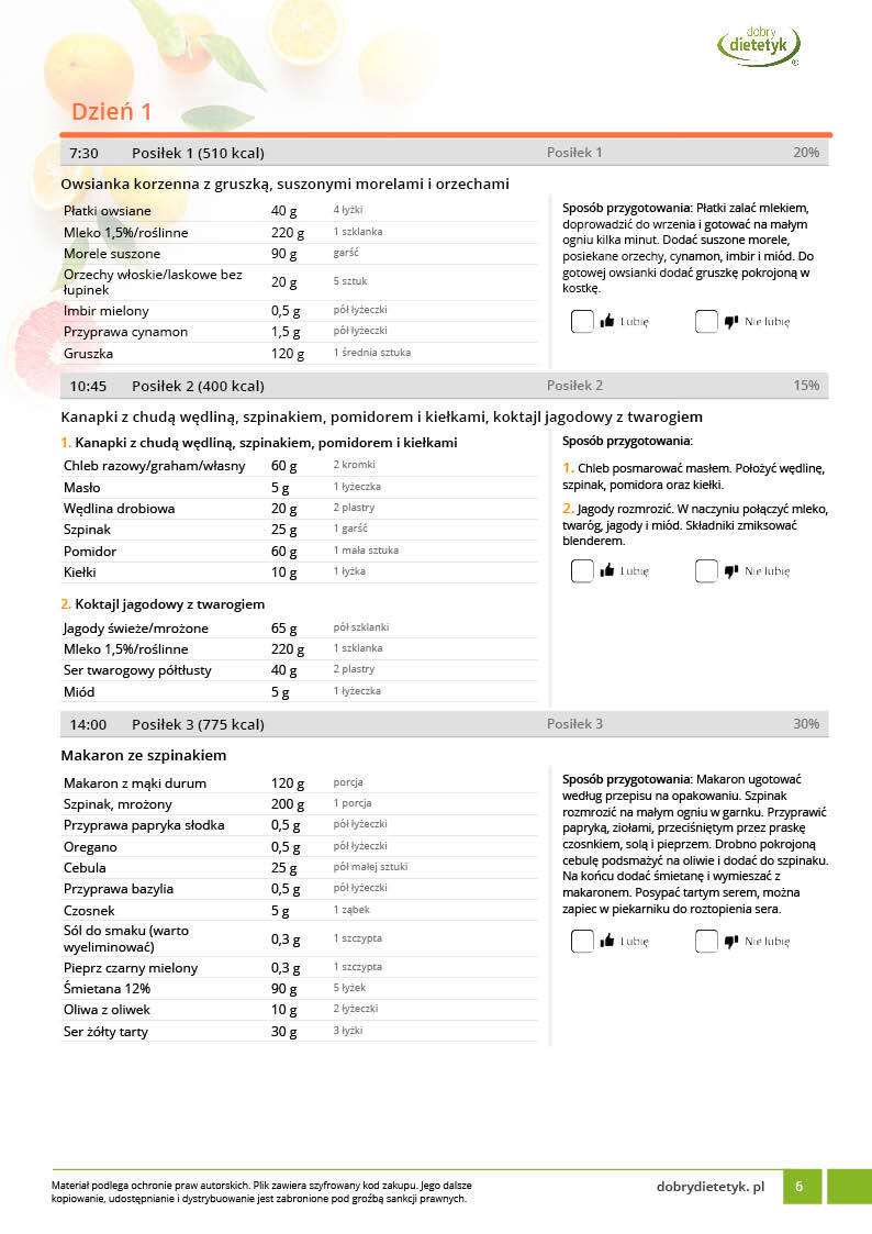 w formie propozycji posiłków (zamiast pojedynczych jadłospisów jednodniowych, przygotowano propozycje kilku propozycji dań na każdy posiłek). Tutaj nie uzależniamy Cię od tego jakie masz np. w danym dniu zjeść śniadanie czy obiad, tylko sam wybierasz sobie ulubione danie z kilku przedstawionych przez nas propozycji.