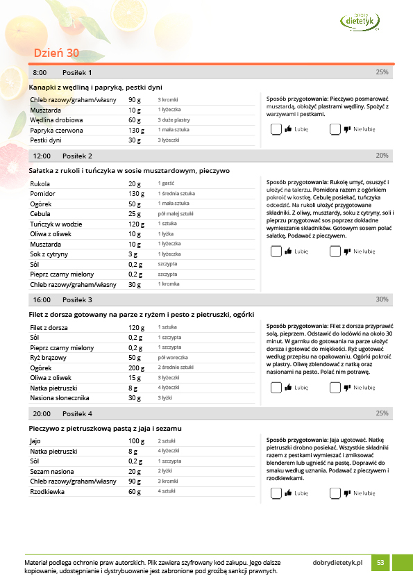w formie precyzyjnych jadłospisów wielodniowych (na każdy dzień miesiąca jest opracowany osobny jadłospis). Tutaj nie musisz zastanawiać się co zjeść każdego dnia, gdyż będziesz mieć dokładnie wszystko rozplanowane.